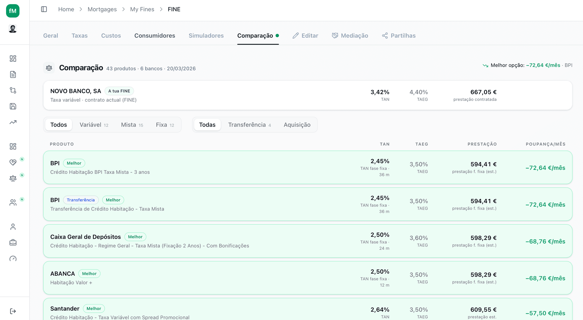 Se ainda não tens uma FINE, podes mesmo assim montar o teu cenário: quanto pedes, por quantos anos, com que entrada (LTV) e uma taxa de referência que tu vais escolher, em função de quanto achas que te vai ser oferecido pelo teu banco, ou simplesmente por teres comparado com as condições de alguns dos teus amigos. Depois vês, na mesma vista, uma lista de bancos e onde a prestação e as taxas se encaixam em relação a essa referência.