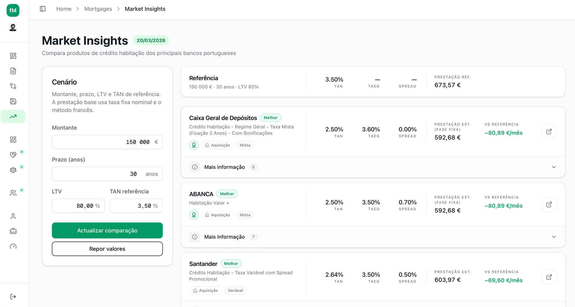 A ferramenta não substitui falar com o banco nem ler o contrato à letra. Falar com um intermediário continua a ser muito importante para negociar, perceber campanhas, cruzar o teu perfil com alternativas e fechar uma oferta real — aqui só tens contexto de mercado, não a proposta fechada.